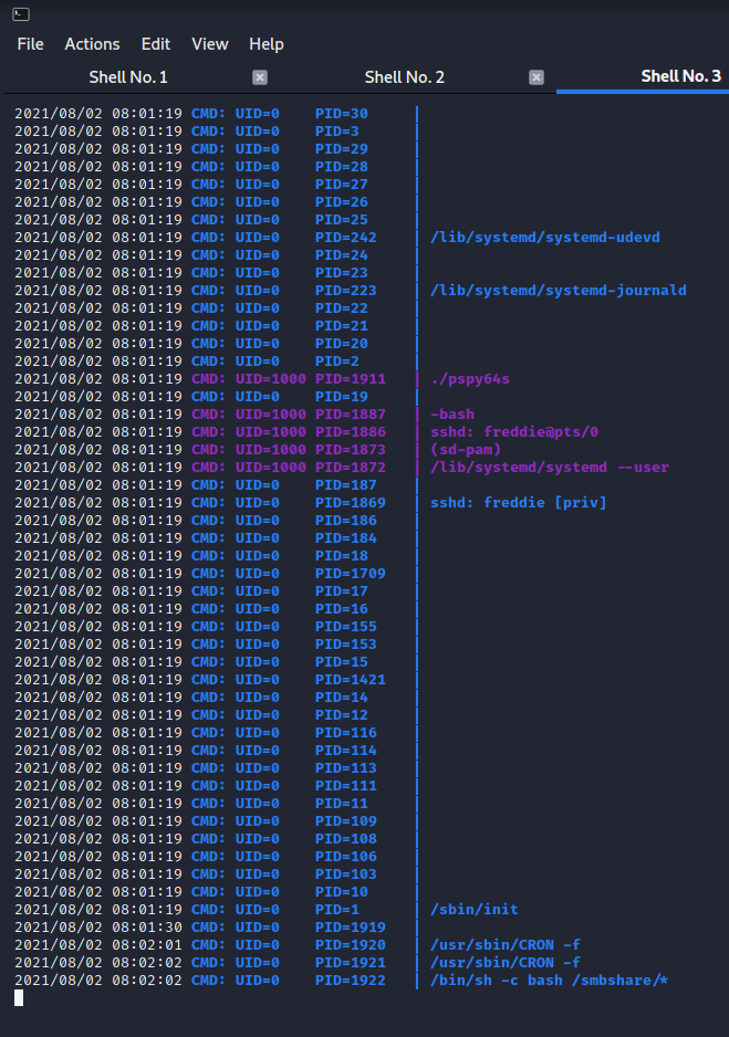 downloaded pspy64s and started to monitor processes. looks like root executing everything in /smbshare folder. we can't access this folder. so it should be smb share's folder.